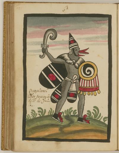 Keywords: Quetzalcoatl, a Major Deity of the Cholula People WDL6756.png Artwork ru Това Хуан де около 1546 г около 1626 г fr Tovar Jean de 1546-1626 env en Tovar Juan de circa 1546-circa 1626 zh 胡安·德·托瓦尔,约 1546 年 - 约 1626 年 pt Tovar Juan de por volta de 1546-por volta de 1626 ar خوان دو توفار، حوالي 1546-حوالي 1626 es Tovar Juan de circa 1546-circa 1626 ru Кетцалькоатль главное божество на ода чолула fr Quetzalcoatl principal dieu du peuple de Cholula en Quetzalcoatl a Major Deity of the Cholula People zh 魁 尔科亚特尔,乔卢拉人的主要神灵 pt Quetzalcoatl uma grande divindade do povo cholula ar كيتسالكواتل، من أسمى آلهة شعب تشولولا ru Кодекс Това а авто ом кото ого считается мексиканский иезуит XVI века Хуан де Това соде жит под обную инфо мацию об об ядах и це емониях ацтеков известных также как мешика Кодекс п оиллюст и ован 51 аква ельным исунком на полную ст аницу Рисунки в кото ых наблюдается значительное влияние пиктог афических укописей доколониальных в емен обладают исключительными художественными достоинствами Рукопись состоит из т ех азделов В пе вом азделе описана исто ия путешествий ацтеков до п ибытия испанцев Вто ой аздел п едставляющий собой иллюст и ованную исто ию ацтеков составляет основной объем укописи В т етьем азделе находится календа ь Това а а этой иллюст ации из вто ого аздела изоб ажен Кетцалькоатль в конусооб азной шляпе и накидке с клювом щитом ук ашенным пе ьями и изогнутым ножом в уках Кетцалькоатль Пе натый змей один из главных богов ацтеков считался богом тво ения связанным с плодо одием и воск ешением а также с дождем в ипостаси Эхекатля бога вет ов В его честь в Чолуле был пост оен большой х ам С ним часто отождествляли Топильцина легенда ного и ве оятно действительно существовавшего ж еца п авившего Тулой в эпоху тольтеков; в описаниях он п едставал как светлокожий бо одатый мужчина Когда в 1519 г Э нан Ко тес п ибыл в ексику импе ато октесума II годы п авления 1502 1520 гг пове ил что Ко тес являлся воплощением Кетцалькоатля акидка шляпа и набед енная повязка напоминают к ылья бабочки символ павших воинов <br>Боги ацтеков; Ацтеки; Кодекс; Индейцы ексики; Ко енные на одности; езоаме ика; Кодекс Това а fr Le codex Tovar attribué à Jean de Tovar jésuite mexicain du XVI<sup>e</sup> siècle contient des informations détaillées sur les rites et les cérémonies des Aztèques également connus sous le nom de Mexicas Il est illustré de 51 aquarelles de la taille d'une page Fortement influencées par les manuscrits pictographiques de la période précontact ces peintures sont d'une qualité artistique exceptionnelle Le manuscrit est divisé en trois sections La première section contient une histoire des voyages des Aztèques avant l'arrivée des Espagnols La seconde section une histoire illustrée du peuple aztèque constitue la majeure partie du manuscrit La troisième section est constituée du calendrier de Tovar Cette illustration extraite de la seconde section représente Quetzalcoatl avec un chapeau conique un bec un bouclier orné de plumes et une cape tenant un couteau incurvé Quetzalcoatl Serpent à plumes l'une des principales divinités aztèques était un dieu de la création associé à la fertilité et à la résurrection mais également à la pluie sous la forme d'Ehecatl ou dieu du vent Cholula un grand temple lui était dédié Souvent assimilé à Topiltzin roi-prêtre légendaire et peut-être historique de Tula durant la période toltèque il était décrit comme ayant le teint clair et portant une barbe Lorsqu'Hernán Cortés arriva au Mexique en 1519 l'empereur Moctezuma II règne 1502 1520 crut qu'il s'agissait de Quetzalcoatl Le motif de la cape du chapeau et du pagne de ce dieu représente les ailes d'un papillon symbole des soldats tombés au combat <br>Dieux aztèques; Aztèques; Codex; Indiens du Mexique; Peuples autochtones; Méso-Amérique; Codex Tovar en The Tovar Codex attributed to the 16th-century Mexican Jesuit Juan de Tovar contains detailed information about the rites and ceremonies of the Aztecs also known as Mexica The codex is illustrated with 51 full-page paintings in watercolor Strongly influenced by pre-contact pictographic manuscripts the paintings are of exceptional artistic quality The manuscript is divided into three sections The first section is a history of the travels of the Aztecs prior to the arrival of the Spanish The second section an illustrated history of the Aztecs forms the main body of the manuscript The third section contains the Tovar calendar This illustration from the second section depicts Quetzalcoatl with conical hat a beak and 