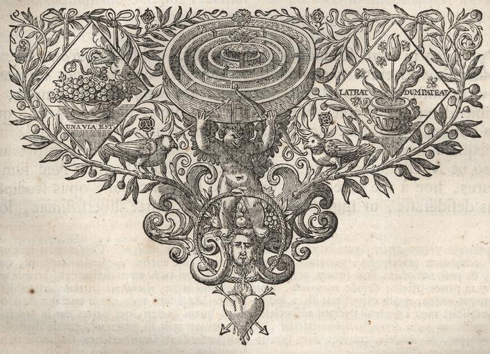 | Keywords: Quintilian, Institutio oratoria ed. Burman (Leiden 1720), p. 209, detail.jpg Quintilian ™s Institutio oratoria ed by Pieter Burman n the Elder Leiden 1720 Full title M Fabii Quinc tiliani de institutione oratoria libri duodecim cum notis et animadversionibus virorum doctorum summa cura recogniti et emendati per Petrum Burmannum Lugduni Batavorum Apud Joannem de Vivie MDCCXX The same woodcut is also used as final ornament on some other pages of this book e g on page 1041 end of book XI and 1114 end of book XII Quintilians Institutio oratoria hrsg von Pieter Burman n dem Älteren Leiden 1720 Voller Titel M Fabii Quinc tiliani de institutione oratoria libri duodecim cum notis et animadversionibus virorum doctorum summa cura recogniti et emendati per Petrum Burmannum Lugduni Batavorum Apud Joannem de Vivie MDCCXX Derselbe Holzschnitt wird u a auch auf S 1041 Ende von Buch XI und 1114 Ende von Buch XII benutzt own Scanned by Aristeas Roman Eisele Artist of woodcut unknown 1720 book printed ; 2010-01-01 scan thumb left The complete page containing this woodcut PD-old Quintilian Institutio oratoria ed Burman Leiden 1720 page 209 1 18th-century woodcuts Emblem books book covers single pages etc Labyrinths in art Round labyrinths |
