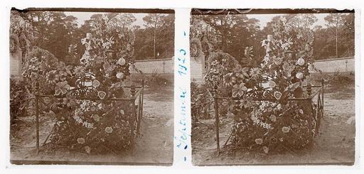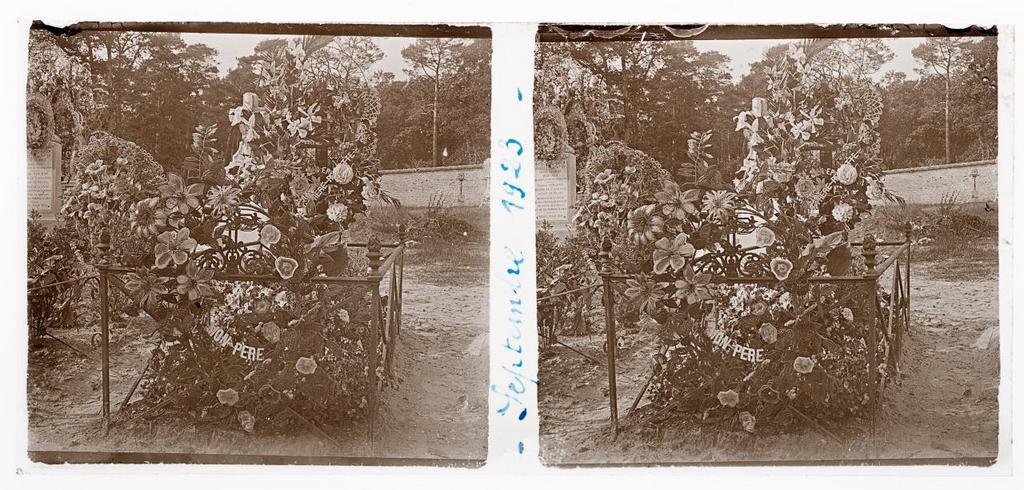 | Keywords: grave death floral tribute flowers france public domain publicdomain abstract photo border monochrome text outdoor texture tree plant Possibly the most elaborate floral tribute that I have ever seen on a grave. Whilst there are no clues as to who this may be for (other than someone's father) the neighbouring gravestone has: "???? Forest Veuve GEORGE 1835-1914 Victor VINCENT Decede [died] le 3 Juin 1922 a l'age de 62 ans" This comes from the same batch of French stereoviews, so is likely to be either Fontainebleau or Normandy. The more I think of this, the more I realise that if this is the grave of the photographers father, or at least a close relative, this may be the one and only chance we have of identifying some of the other people in the set (more portraits from the batch to follow shortly) Possibly the most elaborate floral tribute that I have ever seen on a grave. Whilst there are no clues as to who this may be for (other than someone's father) the neighbouring gravestone has: "???? Forest Veuve GEORGE 1835-1914 Victor VINCENT Decede [died] le 3 Juin 1922 a l'age de 62 ans" This comes from the same batch of French stereoviews, so is likely to be either Fontainebleau or Normandy. The more I think of this, the more I realise that if this is the grave of the photographers father, or at least a close relative, this may be the one and only chance we have of identifying some of the other people in the set (more portraits from the batch to follow shortly) |