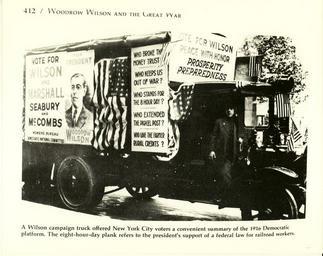 | Keywords: president wilson campaign monochrome Local Accession Number: 2157 Description: Caption reads: "A Wilson campaign truck offered New York City voters a convenient summary of the 1916 Democratic platform. The eight-hour-day plank refers to the president's support ro a federal law for railroad workers." Photographer: Unknown Source: Unknown Size: 8x10 Medium: Print, Black and White Date: 1916 Local Accession Number: 2157 Description: Caption reads: "A Wilson campaign truck offered New York City voters a convenient summary of the 1916 Democratic platform. The eight-hour-day plank refers to the president's support ro a federal law for railroad workers." Photographer: Unknown Source: Unknown Size: 8x10 Medium: Print, Black and White Date: 1916 |