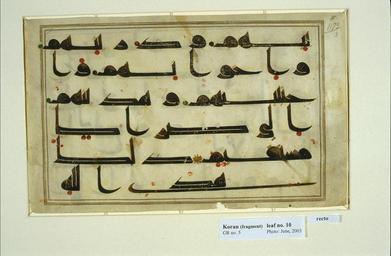 | Keywords: Qur'an manuscript. Surat al-An'am 85-88.tif en This calligraphic fragment includes verses 85-88 of the 6th chapter of the Qur'an entitled Surat al-An'am The Cattle This late Meccan surah describes the nature of God and how He reveals Himself Verses 85-88 in particular describe a number of prophets such as Jesus Elias and Jonah as capable of guiding believers to the straight path al-sirat al-mustaqim The text is executed in Kufi script in black ink at six lines per page surrounded by a gold painted frame Verses on the fragment's recto have worn off substantially as they were executed on the flesh side of the parchment On the recto's third line appears a fifth-verse marker separating verse 85 from 86 It is in the shape of a gold upturned virgule Other verse markers on the recto and verso take the form of a gold flower with a central blue dot Diacritics appear as red dots and marks for vowel-lessness sukun as green dots Other diacritical marks are shaped as diagonal strokes and may have been inserted at a later date The text's Kufi script is in the style typical of horizontal Qur'ans produced on parchment during the ninth century fa نسخه ای خطی از قرآن به خط کوفی، سدهٔ نهم میلادی شامل آیات ۸۵-۸۸ سورهٔ «انعام» ar تتضمن هذه الرقعة المكتوبة بالخط المزخرف الآيات ٨٥-٨٨ من الفصل السادس من القرآن الكريم المعنون بسورة الأنعام الماشية وتصف هذه السورة المكية المتأخرة طبيعة الله وكيف يكشف عن نفسه وتصف الآيات ٨٥-٨٨ بشكل خاص عددا من الأنبياء مثل عيسى وإلياس ويونس على أنهم قادرون على توجيه المؤمنين إلى الطريق المستقيم الصراط المستقيم تم كتابة النص بالخط الكوفي بالحبر الأسود في ستة خطوط لكل صفحة محاطة بإطار ذهبي اللون وقد بليت الآيات المكتوبة على الصفحة اليمنى للرقعة اليمنى بشكل كبير حيث تم تنفيذها على الجانب اللحمي من البارشمان يبدو على السطر الثالث على الصفحة اليمين للرقعة معلم للآية الخامسة يفصل بين الآية ٨٥ والآية ٨٦ وهو على شكل فاصلة مائلة مقلوبة من الذهب أخذت علامات آيات أخرى على الصفحة اليمنى والصفحة اليسرى للرقعة شكل زهرة ذهبية بنقطة مركزية زرقاء ظهرت العلامات الصوتية المميزة كنقط حمراء وعلاماتالسكون غير المشكلةكنقط خضراء شُكلت العلامات المميزة الأخرى على شكل خطوط مائلة وقد أُدخل الكثير منها في وقت لاحق تم تنفيذ النص الكوفي بالنمط المعتاد الأفقي للمصاحف القرآنية المنتجة على البارشمان خلال القرن التاسع es Este fragmento caligráfico incluye los versos 85-88 del capítulo 6 del Qur'an Corán titulado Surat al-An'am el ganado Este surah de la Meca describe la naturaleza de Dios y cómo Él se revela a sí mismo Concretamente los versos 85-88 describen a un número de profetas como Jesús Elías y Jonás como capaces de guiar a los creyentes por el camino recto al-sirat al-mustaqim El texto está ejecutado en escritura kufi en tinta negra con seis líneas por página rodeada por un marco pintado en oro Los versos en el folio recto del fragmento se han desgastado considerablemente debido que fueron escritos sobre el costado de la carne del pergamino En la tercera línea del folio recto aparece un marcador de quinto verso que separa los versos 85 y 86 Tiene forma de una barra dorada hacia arriba Otros marcadores de versos que aparecen en los folios recto y verso adoptan la forma de una flor dorada con un punto azul en el centro Los diacríticos están representados por puntos rojos y las marcas para las supresiones vocálicas sukun como puntos verdes Otras marcas diacríticas tienen forma de trazos diagonales y es probable que fueran insertadas con posterioridad El texto está escrito en el estilo típico de los Qur'ans horizontales hechos en pergamino durante el siglo IX fr Ce fragment calligraphique comprend les versets 85-88 du 6ème chapitre du Coran intitulé Surat al-An'am Le bétail Cette sourate de la Mecque découverte tardivement décrit la nature de Dieu et comment Il se révèle Les versets 85-88 en particulier décrivent un certain nombre de prophètes tels que Jésus Elias et Jonah comme capables de guider les croyants vers la bonne voie al-sirat al-mustaqim Le texte est en dialecte Kufi écrit à l'encre noire six lignes par page entouré d'un cadre peint en or Les versets du fragment au recto sont sensiblement usés ayant été écrits sur le côté du parchemin Sur la troisième ligne au recto apparaît un cinquième verset marqueur séparant le verset 85 du 86 Il a la forme d'une virgule d'or renversée D'autres versets marqueurs sur le recto et le verso ont la forme d'une fleur d'or avec un point bleu au centre Les signes diacritiques apparaissent comme des points rouges marquant les voyelles plus rares sukun comme des points verts D'autres signes diacritiques sont en forme de diagonale et ont été ajoutés ultérieurement Le texte Kufi a été écrit dans le style typique des Qur'ans à l'horizontale sur parchemin produits au cours du neuvième siècle pt Este fragmento caligráfico inclui os versículos 85-88 do Capítulo VI do Alcorão intitulado Surat al-An'am O Gado Este antigo surah de Meca descreve a natureza de Deus e como Ele mesmo se revela Os versículos 85-88 em particular descrevem uma série de profetas tais como Jesus Elias Jonas como sendo capazes de liderar os fiéis para o camin