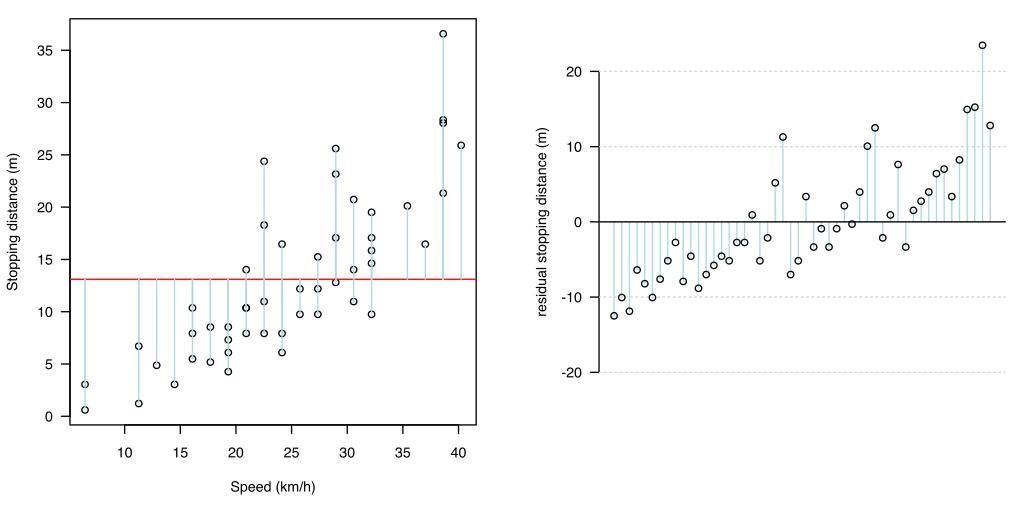 | Keywords: R-car stopping distances 1920+null.svg en A graph of car stopping distances fitted with a simple null model and residual plot Own HYanWong Created with R using the following commands <pre> svg R-car_stopping_distances_1920+null svg 8 4 8 layout t 1 2 par mar c 5 4 1 2 + 0 1 cars speed kph <- cars speed 1 609344 cars dist m <- cars dist 0 3048 plot dist m ~ speed kph data cars xlab Speed km/h ylab Stopping distance m las 1 null model <- lm dist m~1 data cars This creates and stores a model lm means Linear Model abline null model col red abline is a simple function that plots a straight line segments cars speed kph fitted values null model cars speed kph fitted values null model +residuals null model col lightblue par mar c 5 5 1 1 + 0 1 plot residuals null model type h ylim c -25 25 bty n xaxt n las 2 xlab NA ylab residual stopping distance m col lightblue grid NA NULL abline h 0 points residuals null model dev off </pre> Uncategorized 2015 March 23 |