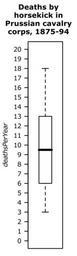 | Keywords: R-horsekick totals-boxplot.svg en Simple boxplot example with discrete data Data von Bortkiewicz's famous dataset of deaths by horse kick in Prussian cavalry corps own HYanWong 2009-03-06 Created with R using the following commands <pre> svg file R-horsekick_totals-boxplot svg width 1 5 height 5 pointsize 8 Simple boxplot example with discrete data Data von Bortkiewicz's famous dataset of deaths by horse kick in Prussian cavalry corps library pscl par mar c 1 4 6 2 +0 1 boxplot tapply prussian y prussian year sum las 1 ylab expression italic deathsPerYear yaxp c 0 20 20 ylim c 0 20 title Deaths by\nhorsekick in\nPrussian cavalry\ncorps 1875-94 outer TRUE line -5 dev off </pre> Box plots |