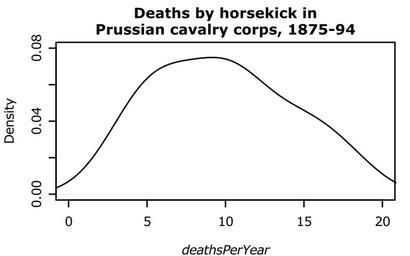| Keywords: R-horsekick totals-density.svg en Example R plot kernel density plot of von Bortkiewicz's famous dataset of deaths by horse kick in Prussian cavalry corps own HYanWong 2009-03-06 v svg file R-horsekick_totals-density svg width 4 height 2 5 pointsize 8 Example R plot kernel density plot of von Bortkiewicz's famous dataset of deaths by horse kick in Prussian cavalry corps library pscl par mar c 4 4 3 1 +0 1 X <- tapply prussian y prussian year sum plot density X ylim c 0 0 08 xlim c 0 20 xlab expression italic deathsPerYear main Deaths by horsekick in\nPrussian cavalry corps 1875-94 dev off Uncategorized 2015 March 23 |