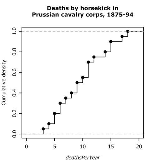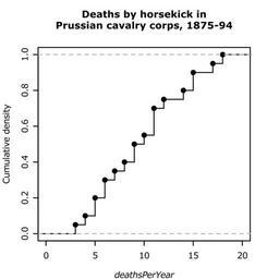 | Keywords: R-horsekick totals-ecdf.svg en Empirical cumulative distribution function ecdf example Data von Bortkiewicz's famous dataset of deaths by horse kick in Prussian cavalry corps own HYanWong 2009-03-06 Created with R using the following commands <pre> svg file R-horsekick_totals-ecdf svg width 4 height 4 pointsize 8 Empirical cumulative distribution function ecdf example Data von Bortkiewicz's famous dataset of deaths by horse kick in Prussian cavalry corps library pscl par mar c 4 4 5 3 +0 1 X <- tapply prussian y prussian year sum plot ecdf X verticals TRUE xlim c 0 20 main xlab expression italic deathsPerYear ylab Cumulative density title Deaths by horsekick in\nPrussian cavalry corps 1875-94 line 2 dev off </pre> Cumulative frequency distribution step functions Created with R |