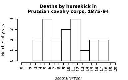 | Keywords: R-horsekick totals-histogram.svg en Histogram example with discrete data Data von Bortkiewicz's famous dataset of deaths by horse kick in Prussian cavalry corps own HYanWong 2009-03-06 Created with R using the following commands <pre> svg file R-horsekick_totals-histogram svg width 4 height 2 5 pointsize 8 Histogram example with discrete data Data von Bortkiewicz's famous dataset of deaths by horse kick in Prussian cavalry corps library pscl par mar c 4 4 4 2 +0 1 X <- tapply prussian y prussian year sum h <- hist X breaks seq 2 5 18 5 by 2 xlim c 0 20 xlab expression italic deathsPerYear xaxt n ylab Number of years main Deaths by horsekick in\nPrussian cavalry corps 1875-94 axis 1 0 20 las 2 dev off </pre> Histograms |