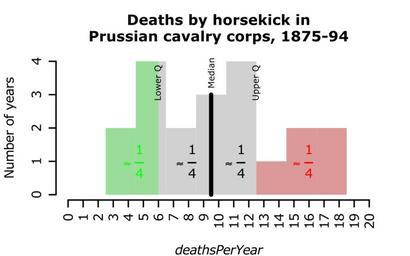 | Keywords: R-horsekick totals-histogram+quartiles.svg en Histogram example with discrete data with median line and quartiles marked by colour Data von Bortkiewicz's famous dataset of deaths by horse kick in Prussian cavalry corps Own HYanWong 2009-03-06 Created with R using the following commands <pre> svg file R-horsekick_totals-histogram+quartiles svg width 4 height 2 5 pointsize 8 Histogram example with discrete data with median line and quartiles marked by colour Data von Bortkiewicz's famous dataset of deaths by horse kick in Prussian cavalry corps library pscl par mar c 4 4 4 2 +0 1 X <- tapply prussian y prussian year sum h <- hist X breaks seq 2 5 18 5 by 2 xlim c 0 20 xlab expression italic deathsPerYear xaxt n ylab Number of years main Deaths by horsekick in\nPrussian cavalry corps 1875-94 col lightgrey border NA axis 1 0 20 las 2 lowQ <- quantile X 0 25 lowQ x <- c h breaksh breaks < lowQ lowQ lowQ y <- h countsh breaks <lowQ rect lowQ x-length lowQ x 0 lowQ x-1 lowQ y col 00FF0044 border NA text lowQ max h counts Lower Q srt 90 adj 1 1 cex 0 7 text mean range lowQ x 1 expression phantom 0 ~~ frac 1 4 phantom 0 col green upQ <- quantile X 0 75 upQ x <- c upQ h breaksh breaks > upQ upQ y <- h counts h breaks > upQ -1 rect upQ x-length upQ x 0 upQ x-1 upQ y col FF000044 border NA text upQ max h counts Upper Q srt 90 adj 1 1 cex 0 7 text mean range upQ x 1 expression phantom 0 ~~ frac 1 4 phantom 0 col red med <- quantile X 0 5 segments med 0 med h countsfindInterval med h breaks lwd 3 text med h countsfindInterval med h breaks Median srt 90 adj -0 2 cex 0 7 text mean c max lowQ x med 1 expression phantom 0 ~~ frac 1 4 phantom 0 text mean c min upQ x med 1 expression phantom 0 ~~ frac 1 4 phantom 0 dev off </pre> Histograms |