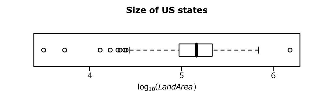 Keywords: R-US state areas-boxplot log.svg en Horizontal boxplot example with logged base 10 continuous data outliers identified by name Data US state areas own HYanWong 2009-03-06 Created with R using the following commands <pre> svg file R-US_state_areas-boxplot_log svg width 5 height 1 5 pointsize 8 Horizontal boxplot example with logged base 10 continuous data outliers identified by name Data US state areas par mar c 3 4 4 1 +0 1 X <- log10 state area 2 58998811 bp <- boxplot X horizontal TRUE xaxt n xlab axis 1 4 6 mgp c 1 0 5 0 title xlab expression log10 italic LandArea mgp c 2 0 5 0 title main Size of US states line 2 5 dev off </pre> Box plots Images with R source code |