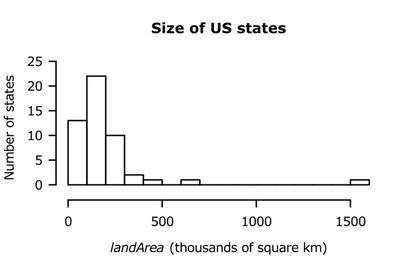 | Keywords: R-US state areas-histogram.svg en Histogram example for continuous data low resolution wide bins Data US state areas own HYanWong 2009-03-06 Created with R using the following commands <pre> svg file R-US_state_areas-histogram svg width 4 height 2 5 pointsize 8 Histogram example for continuous data low resolution wide bins Data US state areas par mar c 4 4 4 2 +0 1 X <- state area 2 58998811/1000 hist X breaks 15 xlab expression paste italic landArea thousands of square km ylab Number of states main Size of US states las 1 ylim c -2 25 dev off </pre> Histograms |