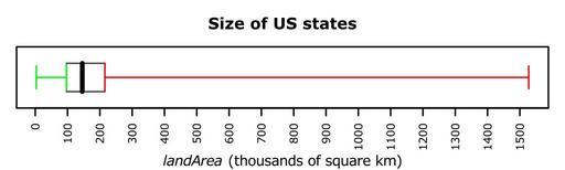 | Keywords: R-US state areas-basicboxplot+colour.svg en Basic horizontal boxplot example no outlier treatment with continuous data coloured to match R-US_state_areas-1D+quartiles Data US state areas Own HYanWong 2009-03-06 Created with R using the following commands <pre> svg file R-US_state_areas-basicboxplot+colour svg width 5 height 1 5 pointsize 8 Basic horizontal boxplot example no outlier treatment with continuous data coloured to match R-US_state_areas-1D+quartiles Data US state areas par mar c 4 1 3 1 +0 1 X <- state area 2 58998811/1000 stripchart X pch NA xlab expression paste italic landArea thousands of square km xaxt n dummy plot to set up axes axis 1 seq 0 2e3 100 cex axis 0 8 las 2 roll our own boxplot to allow different coloured whiskers etc Should be equivalent to boxplot Y range 0 add TRUE corners <- xy coords quantile X c 0 25 0 25 0 75 0 75 c 0 8 1 2 1 2 0 8 segments corners x corners y corners xc 2 3 4 1 corners yc 2 3 4 1 col c green grey30 red grey30 box segments median X 0 8 median X 1 2 lwd 3 median arrows quantile X c 0 25 0 75 1 range X 1 col c green red angle 90 length 0 1 whiskers title Size of US states dev off </pre> Box plots Images with R source code |