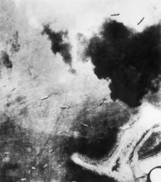 | Keywords: RAAF reconnaissance photo of Truk Lagoon in January 1942.JPG A Royal Australian Air Force reconnaissance photo of Truk Lagoon on 9 January 1942 showing Eten Island in the lower right The reconnaissance mission was flown by flight Lieutenant Yeowart and crew in a specially fitted Lockheed Hudson Mk IV of No 6 Squadron RAAF This operation invovled a return flight of 2261 km from Kavieng New Britain and was the longest sea reconnaissance which the RAAF had undertaken in a land based aircraft The concentration of enemy shipping and aircraft seen at Truk gave warning of the Japanese thrust south to New Britain and New Ireland in the next two weeks 128121 1942-01-09 Australian armed forces Image copyright Copyright expired - public domain frame cropped PD-Australia Chuuk Islands Pacific War in January 1942 |