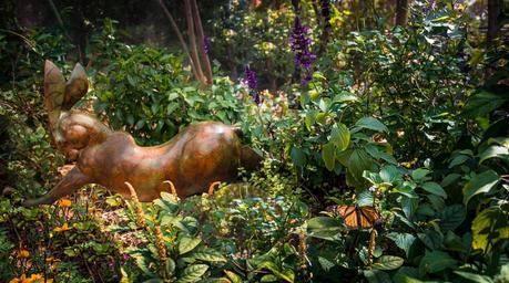 Keywords: rabbit sculpture statue garden green flowers nature colorful