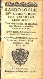 | Keywords: Rabdology Cover Page.jpg Cover page of Rabdologiæ published in 1617 by John Napier Première de couverture de l'ouvrage Rabdologiæ publié en 1617 par Neper Scan by Computer History Museum 1617 Creator John Napier PD-old-100 1617 works in Europe 1617 book covers Book covers from the United Kingdom Mathematics book covers |