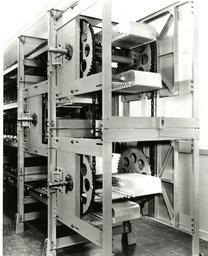| Keywords: RabinowJacob 010.jpg In 1957 Jacob Rabinowâ ‚¬ „˘s company Rabinow Engineering designed a mechanical coding and sorting system for the U S Post Office Based on similar work Rabinow had done previously for the Census Bureau the system for the Post Office consisted of a conveyor belt cart designed to carry 12 envelopes in separate compartments Each compartment in the cart was accompanied by an escort memory The escort memory consisted of a shaft carrying a series of nylon code wheels Each of the 134 wheels could move laterally into one of two positions With this combination more than 8000 in decimal notation binary numbers could be set Twelve keyboard operators would read envelope addresses and set the positions of the code wheels The wheels were supported on a track also composed of binary elements When the encoded compartment hit the same encoded position on the track the shaft dropped triggering a door release in the compartment holding the envelope The envelope then fell into the appropriate pocket About 600 of the letter sorting machines were built and used by the Post Office In later operations optical character recognition technology replaced the keyboard operators and the mechanical escort memory was replaced by computer memory Reference Inventing for Fun and Profit Jacob Rabinow San Francisco Press San Francisco CA 1990 pp 100-138 National Institute of Standards and Technology National Institute of Standards and Technology PD-USGov-NIST PD-USGov Postal equipment |