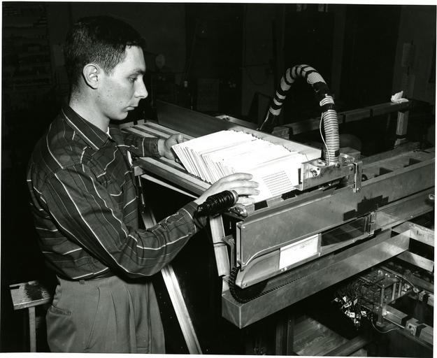 | Keywords: RabinowJacob 041.jpg In 1957 Jacob Rabinowâ ‚¬ „˘s company Rabinow Engineering designed a mechanical coding and sorting system for the U S Post Office Based on similar work Rabinow had done previously for the Census Bureau the system for the Post Office consisted of a conveyor belt cart designed to carry 12 envelopes in separate compartments Each compartment in the cart was accompanied by an escort memory The escort memory consisted of a shaft carrying a series of nylon code wheels Each of the 134 wheels could move laterally into one of two positions With this combination more than 8000 in decimal notation binary numbers could be set Twelve keyboard operators would read envelope addresses and set the positions of the code wheels The wheels were supported on a track also composed of binary elements When the encoded compartment hit the same encoded position on the track the shaft dropped triggering a door release in the compartment holding the envelope The envelope then fell into the appropriate pocket About 600 of the letter sorting machines were built and used by the Post Office In later operations optical character recognition technology replaced the keyboard operators and the mechanical escort memory was replaced by computer memory Reference Inventing for Fun and Profit Jacob Rabinow San Francisco Press San Francisco CA 1990 pp 100-138 National Institute of Standards and Technology 4/1/1958 National Institute of Standards and Technology PD-USGov-NIST PD-USGov Postal equipment |