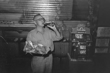| Keywords: RacelandPlateOCrabsSlotMachine.jpg Standing man holding plate of boiled crabs and drinking a bottled beer interior of bar in Raceland Louisiana Note slot machine at right Photo by Russell Lee for Farm Security Administration/WPA via http //hdl loc gov/loc pnp/fsa 8a23712 1938-09 Creator Russell Lee PD-USGov 1938 in Louisiana Interiors of bars in Louisiana Bars in Raceland Louisiana Crab dishes Beer drinking People drinking from bottles People with beer bottles Fashion in 1938 Men with glasses September 1938 in the United States Russell Lee Slot machines in Louisiana Black and white photographs of Louisiana |