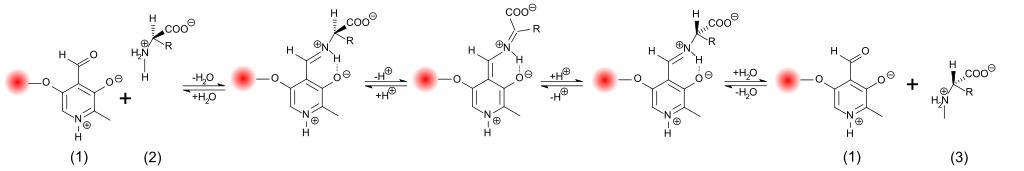 | Keywords: Racemization with PLP 01.svg Racemisation of amino acids under the catalytic influence of pyridoxal phosphate PLP Racemisierung einer Aminosäure unter dem katalytischen Einfluss von Pyridoxalphosphat PLP own made with Inkscape and BKChem 2012-09-21 Kuebi Armin Kübelbeck Racemic mixture |