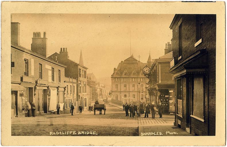 | Keywords: Radcliffe bridge 19th century.jpg en The lack of tram lines dates this image to before 1905 when tram lines were laid in the town This is a postcard image taken from Blackburn Street looking north The bridge is central to the image The postcard may be called Radcliffe Bridge because of the bridge itself or because that was the original name for the hamlet Radcliffe historically was two hamlets Radcliffe to the east at the parish church and Radcliffe Bridge The River Irwell flows under this bridge The church of St John can be seen in the distance demolished 1970s the large building in the centre is the co-op now sadly demolished Postcard from Ebay seller Sharples before 1905 PD-old Radcliffe Greater Manchester |