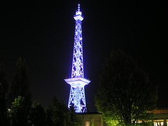 Keywords: radio tower berlin night tower illuminated blue architecture building transmission tower