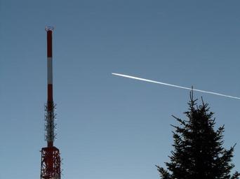 Keywords: radio tower radio mast greened transmission tower aircraft contrail fly travel back light sky