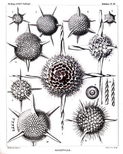 | Keywords: Radiolaria (Challenger) Plate 021.jpg  follows <table> <tr> <td style text-align center; vertical-align top; colspan 3 >Plate 21 Cubosphærida </td> </tr> <tr> <td style font-size 85 ; text-align right; vertical-align top; colspan 3 >Diam </td> </tr> <tr> <td style vertical-align top; >Fig 1 Hexastylus cochleatus n sp </td> <td style vertical-align bottom; >×</td> <td style text-align right; vertical-align bottom; >400</td> </tr> <tr> <td style font-size 85 ; padding-left 3em; text-indent -1em; vertical-align top; >From the central caspule enclosed in the shell numerous delicate radial pseudopodia arise which are protruded through the pores of the shell </td> </tr> <tr> <td style vertical-align top; >Fig 2 Hexastylus triaxonius n sp </td> <td style vertical-align bottom; >×</td> <td style text-align right; vertical-align bottom; >400</td> </tr> <tr> <td style vertical-align top; >Fig 3 Hexastylus phænaxonius n sp </td> <td style vertical-align bottom; >×</td> <td style text-align right; vertical-align bottom; >300</td> </tr> <tr> <td style vertical-align top; >Fig 4 Hexastylus thaletis n sp </td> <td style vertical-align bottom; >×</td> <td style text-align right; vertical-align bottom; >400</td> </tr> <tr> <td style vertical-align top; >Fig 5 Hexastylus minimus n sp </td> <td style vertical-align bottom; >×</td> <td style text-align right; vertical-align bottom; >400</td> </tr> <tr> <td style vertical-align top; >Fig 6 Hexastylus dimensivus n sp </td> <td style vertical-align bottom; >×</td> <td style text-align right; vertical-align bottom; >400</td> </tr> <tr> <td style vertical-align top; >Fig 7 Hexastylus spiralis n sp </td> <td style vertical-align bottom; >×</td> <td style text-align right; vertical-align bottom; >400</td> </tr> <tr> <td style vertical-align top; >Fig 8 Hexastylus dictyotus n sp </td> <td style vertical-align bottom; >×</td> <td style text-align right; vertical-align bottom; >400</td> </tr> <tr> <td style vertical-align top; >Fig 9 Hexastylus dictyotus n sp </td> <td style vertical-align bottom; >×</td> <td style text-align right; vertical-align bottom; >400</td> </tr> <tr> <td style font-size 85 ; padding-left 3em; text-indent -1em; vertical-align top; >Central capsule with concentric nucleus and nucleolus; the protoplasm is radially striped </td> </tr> <tr> <td style vertical-align top; >Fig 10 Hexastylus marginatus n sp </td> <td style vertical-align bottom; >×</td> <td style text-align right; vertical-align bottom; >400</td> </tr> <tr> <td style font-size 85 ; padding-left 3em; text-indent -1em; vertical-align top; >Fig 10a Radial section through the shell-wall </td> </tr> <tr> <td style vertical-align top; >Fig 11 Hexastylus solonis n sp </td> <td style vertical-align bottom; >×</td> <td style text-align right; vertical-align bottom; >400</td> </tr> <tr> <td style vertical-align top; >Fig 12 Hexastylus contortus n sp </td> <td style vertical-align bottom; >×</td> <td style text-align right; vertical-align bottom; >300</td> </tr> </table> https //archive org/details/reportonradiolar00haecrich 1887 Ernst Haeckel 1834-1919 ; engravings by Adolf Giltsch 1852-1911 PD-old-auto-1923 1919 Report on the Radiolaria |