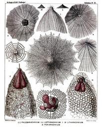 | Keywords: Radiolaria (Challenger) Plate 055.jpg follows <table> <tr> <td style text-align center; vertical-align top; colspan 3 >Plate 55 Phænocalpida Anthocyrtida et Sethocyrtida </td> </tr> <tr> <td style font-size 85 ; text-align right; vertical-align top; colspan 3 >Diam </td> </tr> <tr> <td style vertical-align top; >Fig 1 Sethoconus facetus n sp vel Phlebarachnium facetum </td> <td style vertical-align bottom; >×</td> <td style text-align right; vertical-align bottom; >300</td> </tr> <tr> <td style font-size 85 ; padding-left 3em; text-indent -1em; vertical-align top; >Upper part of the shell </td> </tr> <tr> <td style vertical-align top; >Fig 2 Sethoconus venosus n sp vel Phlebarachnium venosum </td> <td style vertical-align bottom; >×</td> <td style text-align right; vertical-align bottom; >250</td> </tr> <tr> <td style font-size 85 ; padding-left 3em; text-indent -1em; vertical-align top; >Shell including the four-lobed central capsule </td> </tr> <tr> <td style vertical-align top; >Fig 3 Sethophormis aurelia n sp vel Leptarachnium aurelia </td> <td style vertical-align bottom; >×</td> <td style text-align right; vertical-align bottom; >100</td> </tr> <tr> <td style font-size 85 ; padding-left 3em; text-indent -1em; vertical-align top; >Shell seen from above </td> </tr> <tr> <td style vertical-align top; >Fig 4 Sethophormis aurelia n sp </td> <td style vertical-align bottom; >×</td> <td style text-align right; vertical-align bottom; >400</td> </tr> <tr> <td style font-size 85 ; padding-left 3em; text-indent -1em; vertical-align top; >Cephalis more enlarged with the enclosed four-lobed central capsule </td> </tr> <tr> <td style vertical-align top; >Fig 5 Cladarachnium ramosum n sp </td> <td style vertical-align bottom; >×</td> <td style text-align right; vertical-align bottom; >300</td> </tr> <tr> <td style font-size 85 ; padding-left 3em; text-indent -1em; vertical-align top; >Apical view </td> </tr> <tr> <td style vertical-align top; >Fig 6 Cladarachnium ramosum n sp </td> <td style vertical-align bottom; >×</td> <td style text-align right; vertical-align bottom; >70</td> </tr> <tr> <td style font-size 85 ; padding-left 3em; text-indent -1em; vertical-align top; >Lateral view </td> </tr> <tr> <td style vertical-align top; >Fig 7 Bathropyramis interrupta n sp </td> <td style vertical-align bottom; >×</td> <td style text-align right; vertical-align bottom; >300</td> </tr> <tr> <td style font-size 85 ; padding-left 3em; text-indent -1em; vertical-align top; >Apical part of the shell from above </td> </tr> <tr> <td style vertical-align top; >Fig 8 Litharachnium araneosum n sp </td> <td style vertical-align bottom; >×</td> <td style text-align right; vertical-align bottom; >300</td> </tr> <tr> <td style font-size 85 ; padding-left 3em; text-indent -1em; vertical-align top; >Apical part of the shell from above </td> </tr> <tr> <td style vertical-align top; >Fig 9 Litharachnium epeira n sp </td> <td style vertical-align bottom; >×</td> <td style text-align right; vertical-align bottom; >500</td> </tr> <tr> <td style font-size 85 ; padding-left 3em; text-indent -1em; vertical-align top; >Oblique view of the shell </td> </tr> <tr> <td style vertical-align top; >Fig 10 Litharachnium araneosum n sp </td> <td style vertical-align bottom; >×</td> <td style text-align right; vertical-align bottom; >50</td> </tr> <tr> <td style font-size 85 ; padding-left 3em; text-indent -1em; vertical-align top; >Lateral view </td> </tr> <tr> <td style vertical-align top; >Fig 11 Periarachnium periplectum n sp </td> <td style vertical-align bottom; >×</td> <td style text-align right; vertical-align bottom; >500</td> </tr> <tr> <td style font-size 85 ; padding-left 3em; text-indent -1em; vertical-align top; >Shell enclosing the trilobed central capsule </td> </tr> </table> https //archive org/details/reportonradiolar00haecrich 1887 Ernst Haeckel 1834-1919 ; engravings by Adolf Giltsch 1852-1911 PD-old-auto-1923 1919 Report on the Radiolaria |