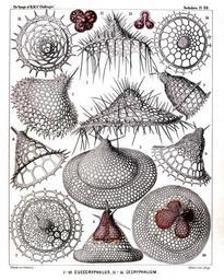 | Keywords: Radiolaria (Challenger) Plate 059.jpg follows <table> <tr> <td style text-align center; vertical-align top; colspan 3 >Plate 59 Tripocyrtida Podocyrtida et Phormocyrtida </td> </tr> <tr> <td style font-size 85 ; text-align right; vertical-align top; colspan 3 >Diam </td> </tr> <tr> <td style vertical-align top; >Fig 1 Lampromitra huxleyi n sp </td> <td style vertical-align bottom; >×</td> <td style text-align right; vertical-align bottom; >400</td> </tr> <tr> <td style vertical-align top; >Fig 2 Amphiplecta callistoma n sp </td> <td style vertical-align bottom; >×</td> <td style text-align right; vertical-align bottom; >400</td> </tr> <tr> <td style vertical-align top; >Fig 3 Corocalyptra agnesæ n sp </td> <td style vertical-align bottom; >×</td> <td style text-align right; vertical-align bottom; >400</td> </tr> <tr> <td style vertical-align top; >Fig 4 Corocalyptra emmæ n sp </td> <td style vertical-align bottom; >×</td> <td style text-align right; vertical-align bottom; >400</td> </tr> <tr> <td style font-size 85 ; padding-left 3em; text-indent -1em; vertical-align top; >The shell encloses the trilobate central capsule with the trilobate nucleus </td> </tr> <tr> <td style vertical-align top; >Fig 5 Clathrocyclas cassiopejæ n sp </td> <td style vertical-align bottom; >×</td> <td style text-align right; vertical-align bottom; >400</td> </tr> <tr> <td style vertical-align top; >Fig 6 Clathrocyclas alcmenæ n sp </td> <td style vertical-align bottom; >×</td> <td style text-align right; vertical-align bottom; >400</td> </tr> <tr> <td style vertical-align top; >Fig 7 Clathrocyclas latonæ n sp </td> <td style vertical-align bottom; >×</td> <td style text-align right; vertical-align bottom; >400</td> </tr> <tr> <td style font-size 85 ; padding-left 3em; text-indent -1em; vertical-align top; >Apical view </td> </tr> <tr> <td style vertical-align top; >Fig 8 Diplocylas bicorona n sp </td> <td style vertical-align bottom; >×</td> <td style text-align right; vertical-align bottom; >400</td> </tr> <tr> <td style vertical-align top; >Fig 9 Clathrocyclas ionis n sp </td> <td style vertical-align bottom; >×</td> <td style text-align right; vertical-align bottom; >400</td> </tr> <tr> <td style vertical-align top; >Fig 10 Corocalyptra elisabethæ n sp </td> <td style vertical-align bottom; >×</td> <td style text-align right; vertical-align bottom; >400</td> </tr> <tr> <td style font-size 85 ; padding-left 3em; text-indent -1em; vertical-align top; >Oblique apical view of the shell with the quadrilobate central capsule enclosed </td> </tr> <tr> <td style vertical-align top; >Fig 11 Clathrocyclas europæ n sp </td> <td style vertical-align bottom; >×</td> <td style text-align right; vertical-align bottom; >400</td> </tr> <tr> <td style font-size 85 ; padding-left 3em; text-indent -1em; vertical-align top; >Apical view of the shell after removal of the cephalis </td> </tr> <tr> <td style vertical-align top; >Fig 12 Clathrocyclas europæ n sp </td> <td style vertical-align bottom; >×</td> <td style text-align right; vertical-align bottom; >400</td> </tr> <tr> <td style font-size 85 ; padding-left 3em; text-indent -1em; vertical-align top; >Central capsule seen from above with the quadrilobate nucleus </td> </tr> <tr> <td style vertical-align top; >Fig 13 Clathrocyclas danaës n sp </td> <td style vertical-align bottom; >×</td> <td style text-align right; vertical-align bottom; >300</td> </tr> <tr> <td style font-size 85 ; padding-left 3em; text-indent -1em; vertical-align top; >Vertical section through the cephalis and the quadrilobate central capsule with the quadrilobate nucleus </td> </tr> <tr> <td style vertical-align top; >Fig 14 Clathrocyclas danaës n sp </td> <td style vertical-align bottom; >×</td> <td style text-align right; vertical-align bottom; >300</td> </tr> <tr> <td style font-size 85 ; padding-left 3em; text-indent -1em; vertical-align top; >Apical view of the shell </td> </tr> </table> https //archive org/details/reportonradiolar00haecrich 1887 Ernst Haeckel 1834-1919 ; engravings by Adolf Giltsch 1852-1911 PD-old-auto-1923 1919 Report on the Radiolaria |