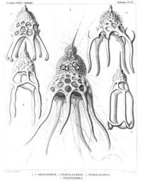 | Keywords: Radiolaria (Challenger) Plate 065.jpg follows <table> <tr> <td style text-align center; vertical-align top; colspan 3 >Plate 65 Phormocyrtida </td> </tr> <tr> <td style font-size 85 ; text-align right; vertical-align top; colspan 3 >Diam </td> </tr> <tr> <td style vertical-align top; >Fig 1 Alacorys friderici n sp vel Hexalacorys friderici </td> <td style vertical-align bottom; >×</td> <td style text-align right; vertical-align bottom; >400</td> </tr> <tr> <td style font-size 85 ; padding-left 3em; text-indent -1em; vertical-align top; >The central capsule enclosed in the fenestrated shell exhibits in its lower half four large club-shaped lobes each of which includes in its upper part a large oil-globule The uppermost undivided part of the capsule includes the nucleus which protrudes four small nuclear lobes through the four holes of the cortinar septum into the thorax Numerous long pseudopodia arise from the granular sarcomatrix which the capsule surrounds and pass through the pores of the siliceous shell </td> </tr> <tr> <td style vertical-align top; >Fig 2 Alacorys guilelmi n sp vel Hexalacorys guilelmi </td> <td style vertical-align bottom; >×</td> <td style text-align right; vertical-align bottom; >300</td> </tr> <tr> <td style vertical-align top; >Fig 3 Alacorys bismarckii n sp vel Pentalacorys bismarckii </td> <td style vertical-align bottom; >×</td> <td style text-align right; vertical-align bottom; >200</td> </tr> <tr> <td style vertical-align top; >Fig 4 Alacorys lutheri n sp vel Tetralacorys lutheri </td> <td style vertical-align bottom; >×</td> <td style text-align right; vertical-align bottom; >400</td> </tr> <tr> <td style vertical-align top; >Fig 5 Cycladophora goetheana n sp vel Lampterium goetheanum </td> <td style vertical-align bottom; >×</td> <td style text-align right; vertical-align bottom; >300</td> </tr> </table> https //archive org/details/reportonradiolar00haecrich 1887 Ernst Haeckel 1834-1919 ; engravings by Adolf Giltsch 1852-1911 PD-old-auto-1923 1919 Report on the Radiolaria |