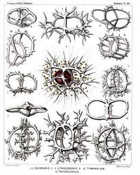 | Keywords: Radiolaria (Challenger) Plate 082.jpg follows <table> <tr> <td style text-align center; vertical-align top; colspan 3 >Plate 82 Coronida et Tympanida </td> </tr> <tr> <td style font-size 85 ; text-align right; vertical-align top; colspan 3 >Diam </td> </tr> <tr> <td style vertical-align top; >Fig 1 Coronidium cervicorne n sp </td> <td style vertical-align bottom; >×</td> <td style text-align right; vertical-align bottom; >400</td> </tr> <tr> <td style font-size 85 ; padding-left 3em; text-indent -1em; vertical-align top; >Seen from the apical pole </td> </tr> <tr> <td style vertical-align top; >Fig 2 Coronidium acacia n sp </td> <td style vertical-align bottom; >×</td> <td style text-align right; vertical-align bottom; >300</td> </tr> <tr> <td style vertical-align top; >Fig 3 Eucoronis angulata n sp </td> <td style vertical-align bottom; >×</td> <td style text-align right; vertical-align bottom; >400</td> </tr> <tr> <td style font-size 85 ; padding-left 3em; text-indent -1em; vertical-align top; >Half from the apical half from the dorsal side </td> </tr> <tr> <td style vertical-align top; >Fig 4 Eucoronis challengeri n sp </td> <td style vertical-align bottom; >×</td> <td style text-align right; vertical-align bottom; >400</td> </tr> <tr> <td style font-size 85 ; padding-left 3em; text-indent -1em; vertical-align top; >The red central capsule encloses a large ovate nucleus and is surrounded by numerous xanthellæ </td> </tr> <tr> <td style vertical-align top; >Fig 5 Eucoronis nephrospyris n sp </td> <td style vertical-align bottom; >×</td> <td style text-align right; vertical-align bottom; >300</td> </tr> <tr> <td style vertical-align top; >Fig 6 Eucoronis perspicillum n sp </td> <td style vertical-align bottom; >×</td> <td style text-align right; vertical-align bottom; >300</td> </tr> <tr> <td style vertical-align top; >Fig 7 Coronidium dyostephanus n sp </td> <td style vertical-align bottom; >×</td> <td style text-align right; vertical-align bottom; >400</td> </tr> <tr> <td style font-size 85 ; padding-left 3em; text-indent -1em; vertical-align top; >Seen from the apical pole </td> </tr> <tr> <td style vertical-align top; >Fig 8 Coronidium diadema n sp </td> <td style vertical-align bottom; >×</td> <td style text-align right; vertical-align bottom; >300</td> </tr> <tr> <td style vertical-align top; >Fig 9 Acrocubus octopylus n sp </td> <td style vertical-align bottom; >×</td> <td style text-align right; vertical-align bottom; >300</td> </tr> <tr> <td style vertical-align top; >Fig 10 Parastephanus asymmetricus n sp </td> <td style vertical-align bottom; >×</td> <td style text-align right; vertical-align bottom; >400</td> </tr> <tr> <td style vertical-align top; >Fig 11 Eutympanium militare n sp </td> <td style vertical-align bottom; >×</td> <td style text-align right; vertical-align bottom; >400</td> </tr> <tr> <td style font-size 85 ; padding-left 3em; text-indent -1em; vertical-align top; >Oblique view </td> </tr> <tr> <td style vertical-align top; >Fig 12 Lithocubus astragalus n sp </td> <td style vertical-align bottom; >×</td> <td style text-align right; vertical-align bottom; >400</td> </tr> <tr> <td style vertical-align top; >Fig 13 Trissocircus globus n sp </td> <td style vertical-align bottom; >×</td> <td style text-align right; vertical-align bottom; >400</td> </tr> </table> https //archive org/details/reportonradiolar00haecrich 1887 Ernst Haeckel 1834-1919 ; engravings by Adolf Giltsch 1852-1911 PD-old-auto-1923 1919 Report on the Radiolaria |