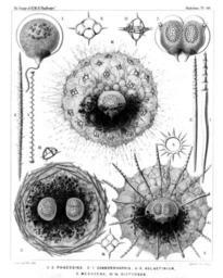 | Keywords: Radiolaria (Challenger) Plate 101.jpg follows <table> <tr> <td style text-align center; vertical-align top; colspan 3 >Plate 101 Phæodinida Cannorrhaphida et Aulacanthida </td> </tr> <tr> <td style font-size 85 ; text-align right; vertical-align top; colspan 3 >Diam </td> </tr> <tr> <td style vertical-align top; >Fig 1 Phæocolla primordialis n sp </td> <td style vertical-align bottom; >×</td> <td style text-align right; vertical-align bottom; >300</td> </tr> <tr> <td style font-size 85 ; padding-left 3em; text-indent -1em; vertical-align top; >Central capsule isolated The double contoured outer mmbrane exhibits only one opening with a radiate operculum and long proboscis The granular protoplasm encloses clear spherical vacuoles The sphæroidal nucleus contains irregular amœboid nucleoli </td> </tr> <tr> <td style vertical-align top; >Fig 2 Phæodina tripylea n sp </td> <td style vertical-align bottom; >×</td> <td style text-align right; vertical-align bottom; >300</td> </tr> <tr> <td style font-size 85 ; padding-left 3em; text-indent -1em; vertical-align top; >A central capsule in self-division with two elliptical nuclei The astropyle is already bisected and has two proboscides </td> </tr> <tr> <td style vertical-align top; >Fig 3 Cannorrhaphis spinulosa n sp </td> <td style vertical-align bottom; >×</td> <td style text-align right; vertical-align bottom; >300</td> </tr> <tr> <td style font-size 85 ; padding-left 3em; text-indent -1em; vertical-align top; >A complete specimen with two central capsules each of which contains two nuclei The alveolate calymma contains a dark phæodium and is surrounded by tangential tubular needles </td> </tr> <tr> <td style vertical-align top; >Fig 4 Cannorrhaphis spinulosa n sp </td> <td style vertical-align bottom; >×</td> <td style text-align right; vertical-align bottom; >300</td> </tr> <tr> <td style font-size 85 ; padding-left 3em; text-indent -1em; vertical-align top; >A single tangential tube </td> </tr> <tr> <td style vertical-align top; >Fig 5 Cannorrhaphis spathillata n sp </td> <td style vertical-align bottom; >×</td> <td style text-align right; vertical-align bottom; >300</td> </tr> <tr> <td style font-size 85 ; padding-left 3em; text-indent -1em; vertical-align top; >A single tangential tube </td> </tr> <tr> <td style vertical-align top; >Fig 6 Aulactinium actinastrum n sp </td> <td style vertical-align bottom; >×</td> <td style text-align right; vertical-align bottom; >100</td> </tr> <tr> <td style font-size 85 ; padding-left 3em; text-indent -1em; vertical-align top; >A complete specimen seen in optical meridional section In the centre the spheroidal central capsule with its double membrane and three openings above two lateral parapylæ below the large astropyle with its radiate operculum The capsule encloses numerous spherical vacuoles and two hemispherical nuclei each with numerous nucleoli The anterior half of the capsule is surrounded by the blackish phæodium The spherical calymma contains numerous globular alveoles and is pierced by the radial tubes the proximal ends of which are in contact with the surface of the central capsule compare Pl 103 fig 1 </td> </tr> <tr> <td style vertical-align top; >Fig 7 Aulactinium actinastrum n sp </td> <td style vertical-align bottom; >×</td> <td style text-align right; vertical-align bottom; >300</td> </tr> <tr> <td style font-size 85 ; padding-left 3em; text-indent -1em; vertical-align top; >A single radial tube </td> </tr> <tr> <td style vertical-align top; >Fig 8 Aulactinium actinelium n sp </td> <td style vertical-align bottom; >×</td> <td style text-align right; vertical-align bottom; >200</td> </tr> <tr> <td style font-size 85 ; padding-left 3em; text-indent -1em; vertical-align top; >A single radial tube </td> </tr> <tr> <td style vertical-align top; >Fig 9 Mesocena stellata n sp </td> <td style vertical-align bottom; >×</td> <td style text-align right; vertical-align bottom; >600</td> </tr> <tr> <td style font-size 85 ; padding-left 3em; text-indent -1em; vertical-align top; >A single annular piece of the skeleton</td> </tr> <tr> <td style vertical-align top; >Fig 10 Dictyocha stapedia n sp </td> <td style vertical-align bottom; >×</td> <td style text-align right; vertical-align bottom; >300</td> </tr> <tr> <td style font-size 85 ; padding-left 3em; text-indent -1em; vertical-align top; >A complete specimen observed living at Ceylon In the centre is visible the large spheroidal tripylean central capsule with its three openings containing a large nucleus with numerous nucleoli Its oral half is covered with the dark phæodium The voluminous spherical calymma contains numerous globular alveoles and its surface is covered with scattered stirrup-shaped pieces of the skeleton Numerous free pseudopodia arise from the surface </td> </tr> <tr> <td style vertical-align top; >Fig 11 Dictyocha stapedia n sp </td> <td style vertical-align bottom; >×</td> <td style text-align right; vertical-align bottom; >800</td> </tr> <tr> <td style font-size 85 ; padding-left 3em; text-indent -1em; vertical-align top; >A single piece of the skeleton from above </td> </tr> <tr> <td style vertical-align top; >Fig 12 Dictyocha stapedia n sp </td> <td style vertical-align bottom; >×</td> <td style text-align right; vertical-align bottom; >800</td> </tr> <tr> <td style font-size 85 ; padding-left 3em; text-indent -1em; vertical-align top; >A twin piece of the skeleton </td> </tr> <tr> <td style vertical-align top; >Fig 13 Dictyocha medusa n sp </td> <td style vertical-align bottom; >×</td> <td style text-align right; vertical-align bottom; >800</td> </tr> <tr> <td style font-size 85 ; padding-left 3em; text-indent -1em; vertical-align top; >A single piece of the skeleton from the side </td> </tr> <tr> <td style vertical-align top; >Fig 14 Dictyocha medusa n sp </td> <td style vertical-align bottom; >×</td> <td style text-align right; vertical-align bottom; >800</td> </tr> <tr> <td style font-s