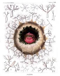 | Keywords: Radiolaria (Challenger) Plate 102.jpg follows <table> <tr> <td style text-align center; vertical-align top; colspan 3 >Plate 102 Aulacanthida </td> </tr> <tr> <td style font-size 85 ; text-align right; vertical-align top; colspan 3 >Diam </td> </tr> <tr> <td style vertical-align top; >Fig 1 Auloceros elegans n sp </td> <td style vertical-align bottom; >×</td> <td style text-align right; vertical-align bottom; >80</td> </tr> <tr> <td style font-size 85 ; padding-left 3em; text-indent -1em; vertical-align top; >A complete specimen observed living at Ceylon In the centre is visible the red central capsule with its three openings containing a large nucleus of half the size with numerous nucleoli The alveolate calymma encloses a green excentric phæodium is surrounded by a veil of interwoven tangential needles and forms conical elevations which enclose the piercing radial tubes Between these radiate numerous pseudopodia compare for the single parts Pl 103 fig 1 and Pl 104 figs 1-3 and their explanation </td> </tr> <tr> <td style vertical-align top; >Figs 2-6 Auloceros furcosus n sp </td> <td style vertical-align bottom; >×</td> <td style text-align right; vertical-align bottom; >100</td> </tr> <tr> <td style font-size 85 ; padding-left 3em; text-indent -1em; vertical-align top; >Distal ends of different radial tubes exhibiting the great variability of this species </td> </tr> <tr> <td style vertical-align top; >Fig 7 Auloceros trigeminus n sp </td> <td style vertical-align bottom; >×</td> <td style text-align right; vertical-align bottom; >300</td> </tr> <tr> <td style font-size 85 ; padding-left 3em; text-indent -1em; vertical-align top; >Distal end of a single tube </td> </tr> <tr> <td style vertical-align top; >Fig 8 Auloceros capreolus n sp </td> <td style vertical-align bottom; >×</td> <td style text-align right; vertical-align bottom; >200</td> </tr> <tr> <td style font-size 85 ; padding-left 3em; text-indent -1em; vertical-align top; >Distal End of a Single Tube </td> </tr> <tr> <td style vertical-align top; >Figs 9 10 Auloceros cervinus n sp </td> <td style vertical-align bottom; >×</td> <td style text-align right; vertical-align bottom; >300</td> </tr> <tr> <td style font-size 85 ; padding-left 3em; text-indent -1em; vertical-align top; >Distal ends of two single tubes </td> </tr> <tr> <td style vertical-align top; >Fig 12 Auloceros spathillaster n sp </td> <td style vertical-align bottom; >×</td> <td style text-align right; vertical-align bottom; >300</td> </tr> <tr> <td style font-size 85 ; padding-left 3em; text-indent -1em; vertical-align top; >Distal end of a single tube </td> </tr> <tr> <td style vertical-align top; >Figs 11 13 Auloceros arborescens n sp </td> <td style vertical-align bottom; >×</td> <td style text-align right; vertical-align bottom; >300</td> </tr> <tr> <td style font-size 85 ; padding-left 3em; text-indent -1em; vertical-align top; >Distal ends of two single tubes </td> </tr> </table> https //archive org/details/reportonradiolar00haecrich 1887 Ernst Haeckel 1834-1919 ; engravings by Adolf Giltsch 1852-1911 PD-old-auto-1923 1919 Report on the Radiolaria |