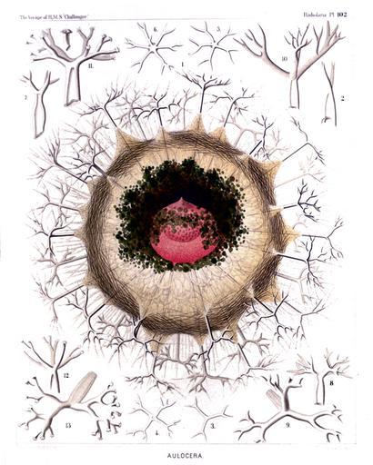 | Keywords: Radiolaria (Challenger) Plate 102.jpg  follows <table> <tr> <td style text-align center; vertical-align top; colspan 3 >Plate 102 Aulacanthida </td> </tr> <tr> <td style font-size 85 ; text-align right; vertical-align top; colspan 3 >Diam </td> </tr> <tr> <td style vertical-align top; >Fig 1 Auloceros elegans n sp </td> <td style vertical-align bottom; >×</td> <td style text-align right; vertical-align bottom; >80</td> </tr> <tr> <td style font-size 85 ; padding-left 3em; text-indent -1em; vertical-align top; >A complete specimen observed living at Ceylon In the centre is visible the red central capsule with its three openings containing a large nucleus of half the size with numerous nucleoli The alveolate calymma encloses a green excentric phæodium is surrounded by a veil of interwoven tangential needles and forms conical elevations which enclose the piercing radial tubes Between these radiate numerous pseudopodia compare for the single parts Pl 103 fig 1 and Pl 104 figs 1-3 and their explanation </td> </tr> <tr> <td style vertical-align top; >Figs 2-6 Auloceros furcosus n sp </td> <td style vertical-align bottom; >×</td> <td style text-align right; vertical-align bottom; >100</td> </tr> <tr> <td style font-size 85 ; padding-left 3em; text-indent -1em; vertical-align top; >Distal ends of different radial tubes exhibiting the great variability of this species </td> </tr> <tr> <td style vertical-align top; >Fig 7 Auloceros trigeminus n sp </td> <td style vertical-align bottom; >×</td> <td style text-align right; vertical-align bottom; >300</td> </tr> <tr> <td style font-size 85 ; padding-left 3em; text-indent -1em; vertical-align top; >Distal end of a single tube </td> </tr> <tr> <td style vertical-align top; >Fig 8 Auloceros capreolus n sp </td> <td style vertical-align bottom; >×</td> <td style text-align right; vertical-align bottom; >200</td> </tr> <tr> <td style font-size 85 ; padding-left 3em; text-indent -1em; vertical-align top; >Distal End of a Single Tube </td> </tr> <tr> <td style vertical-align top; >Figs 9 10 Auloceros cervinus n sp </td> <td style vertical-align bottom; >×</td> <td style text-align right; vertical-align bottom; >300</td> </tr> <tr> <td style font-size 85 ; padding-left 3em; text-indent -1em; vertical-align top; >Distal ends of two single tubes </td> </tr> <tr> <td style vertical-align top; >Fig 12 Auloceros spathillaster n sp </td> <td style vertical-align bottom; >×</td> <td style text-align right; vertical-align bottom; >300</td> </tr> <tr> <td style font-size 85 ; padding-left 3em; text-indent -1em; vertical-align top; >Distal end of a single tube </td> </tr> <tr> <td style vertical-align top; >Figs 11 13 Auloceros arborescens n sp </td> <td style vertical-align bottom; >×</td> <td style text-align right; vertical-align bottom; >300</td> </tr> <tr> <td style font-size 85 ; padding-left 3em; text-indent -1em; vertical-align top; >Distal ends of two single tubes </td> </tr> </table> https //archive org/details/reportonradiolar00haecrich 1887 Ernst Haeckel 1834-1919 ; engravings by Adolf Giltsch 1852-1911 PD-old-auto-1923 1919 Report on the Radiolaria |