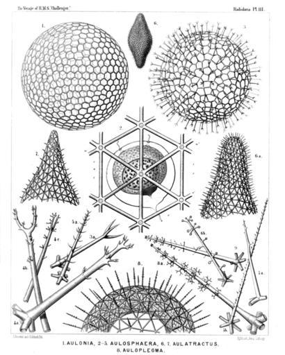 | Keywords: Radiolaria (Challenger) Plate 111.jpg  follows <table> <tr> <td style text-align center; vertical-align top; colspan 3 >Plate 111 Aulosphærida </td> </tr> <tr> <td style font-size 85 ; text-align right; vertical-align top; colspan 3 >Diam </td> </tr> <tr> <td style vertical-align top; >Fig 1 Aulonia hexagonia n sp </td> <td style vertical-align bottom; >×</td> <td style text-align right; vertical-align bottom; >30</td> </tr> <tr> <td style font-size 85 ; padding-left 3em; text-indent -1em; vertical-align top; >The complete spherical shell </td> </tr> <tr> <td style vertical-align top; >Fig 2 Aularia ternaria n sp </td> <td style vertical-align bottom; >×</td> <td style text-align right; vertical-align bottom; >300</td> </tr> <tr> <td style font-size 85 ; padding-left 3em; text-indent -1em; vertical-align top; >A group of six triangular meshes with seven nodal points of radial tubes Behind the central capsule with its double membrane e outer; i inner and radiate operculum o ; u the two outer parapylæ; v vacuoles in the protoplasm The ellipsoidal nucleus n contains numerous nucleoli l </td> </tr> <tr> <td style vertical-align top; >Fig 3 Aulastrum triceros n sp </td> <td style vertical-align bottom; >×</td> <td style text-align right; vertical-align bottom; >50</td> </tr> <tr> <td style font-size 85 ; padding-left 3em; text-indent -1em; vertical-align top; >The complete shell </td> </tr> <tr> <td style vertical-align top; >Fig 3a Aulastrum triceros n sp </td> <td style vertical-align bottom; >×</td> <td style text-align right; vertical-align bottom; >300</td> </tr> <tr> <td style font-size 85 ; padding-left 3em; text-indent -1em; vertical-align top; >A single radial tube </td> </tr> <tr> <td style vertical-align top; >Figs 4a 4b 4c Aulastrum dendroceros n sp </td> <td style vertical-align bottom; >×</td> <td style text-align right; vertical-align bottom; >400</td> </tr> <tr> <td style font-size 85 ; padding-left 3em; text-indent -1em; vertical-align top; >Three single radial spines taken from three different specimens </td> </tr> <tr> <td style vertical-align top; >Fig 5a Aulophacus lenticularis n sp </td> <td style vertical-align bottom; >×</td> <td style text-align right; vertical-align bottom; >300</td> </tr> <tr> <td style font-size 85 ; padding-left 3em; text-indent -1em; vertical-align top; >A single radial spine </td> </tr> <tr> <td style vertical-align top; >Fig 5b Aulophacus amphidiscus n sp </td> <td style vertical-align bottom; >×</td> <td style text-align right; vertical-align bottom; >300</td> </tr> <tr> <td style font-size 85 ; padding-left 3em; text-indent -1em; vertical-align top; >A single radial spine </td> </tr> <tr> <td style vertical-align top; >Fig 6 Aulatractus fusiformis n sp </td> <td style vertical-align bottom; >×</td> <td style text-align right; vertical-align bottom; >5</td> </tr> <tr> <td style font-size 85 ; padding-left 3em; text-indent -1em; vertical-align top; >The complete shell five times enlarged </td> </tr> <tr> <td style vertical-align top; >Fig 6a Aulatractus fusiformis n sp </td> <td style vertical-align bottom; >×</td> <td style text-align right; vertical-align bottom; >20</td> </tr> <tr> <td style font-size 85 ; padding-left 3em; text-indent -1em; vertical-align top; >Apical part of the shell </td> </tr> <tr> <td style vertical-align top; >Fig 6b Aulatractus fusiformis n sp </td> <td style vertical-align bottom; >×</td> <td style text-align right; vertical-align bottom; >400</td> </tr> <tr> <td style font-size 85 ; padding-left 3em; text-indent -1em; vertical-align top; >A single radial tube </td> </tr> <tr> <td style vertical-align top; >Fig 7 Aulatractus diploconus n sp </td> <td style vertical-align bottom; >×</td> <td style text-align right; vertical-align bottom; >20</td> </tr> <tr> <td style font-size 85 ; padding-left 3em; text-indent -1em; vertical-align top; >Apical part of the shell </td> </tr> <tr> <td style vertical-align top; >Fig 7a Aulatractus diploconus n sp </td> <td style vertical-align bottom; >×</td> <td style text-align right; vertical-align bottom; >400</td> </tr> <tr> <td style font-size 85 ; padding-left 3em; text-indent -1em; vertical-align top; >A single radial tube </td> </tr> <tr> <td style vertical-align top; >Fig 8 Auloplegma perplexum n sp </td> <td style vertical-align bottom; >×</td> <td style text-align right; vertical-align bottom; >50</td> </tr> <tr> <td style font-size 85 ; padding-left 3em; text-indent -1em; vertical-align top; >Half the shell </td> </tr> <tr> <td style vertical-align top; >Fig 8a Auloplegma perplexum n sp </td> <td style vertical-align bottom; >×</td> <td style text-align right; vertical-align bottom; >400</td> </tr> <tr> <td style font-size 85 ; padding-left 3em; text-indent -1em; vertical-align top; >A single radial tube </td> </tr> <tr> <td style vertical-align top; >Fig 9 Auloplegma spongiosum n sp </td> <td style vertical-align bottom; >×</td> <td style text-align right; vertical-align bottom; >300</td> </tr> <tr> <td style font-size 85 ; padding-left 3em; text-indent -1em; vertical-align top; >A single radial tube </td> </tr> </table> https //archive org/details/reportonradiolar00haecrich 1887 Ernst Haeckel 1834-1919 ; engravings by Adolf Giltsch 1852-1911 PD-old-auto-1923 1919 Report on the Radiolaria |