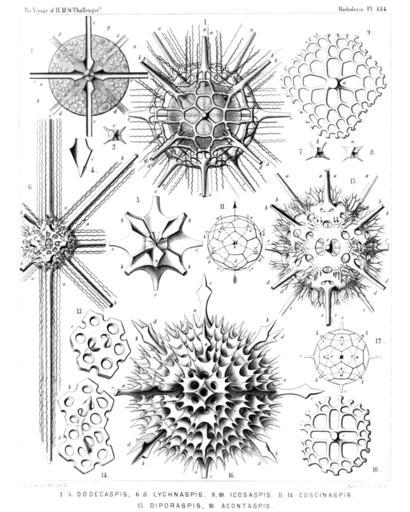 | Keywords: Radiolaria (Challenger) Plate 134.jpg  follows <table> <tr> <td style text-align center; vertical-align top; colspan 3 >Plate 134 Dorataspida </td> </tr> <tr> <td style font-size 85 ; text-align right; vertical-align top; colspan 3 >Diam </td> </tr> <tr> <td style vertical-align top; >Fig 1 Dodecaspis tricincta n sp </td> <td style vertical-align bottom; >×</td> <td style text-align right; vertical-align bottom; >400</td> </tr> <tr> <td style font-size 85 ; padding-left 3em; text-indent -1em; vertical-align top; >The enclosed central capsule contains numerous spherical nuclei </td> </tr> <tr> <td style vertical-align top; >Fig 2 Lychnaspis minima n sp </td> <td style vertical-align bottom; >×</td> <td style text-align right; vertical-align bottom; >400</td> </tr> <tr> <td style font-size 85 ; padding-left 3em; text-indent -1em; vertical-align top; >Six-sided basal pyramid of an equatorial spine with the leaf-cross seen from the centre </td> </tr> <tr> <td style vertical-align top; >Fig 3 Zonaspis cingulata n sp </td> <td style vertical-align bottom; >×</td> <td style text-align right; vertical-align bottom; >400</td> </tr> <tr> <td style font-size 85 ; padding-left 3em; text-indent -1em; vertical-align top; >Equatorial section through the central capsule n nuclei; g yellow bodies intracapsular xanthellæ </td> </tr> <tr> <td style vertical-align top; >Fig 4 Zonaspis cingulata n sp </td> <td style vertical-align bottom; >×</td> <td style text-align right; vertical-align bottom; >800</td> </tr> <tr> <td style font-size 85 ; padding-left 3em; text-indent -1em; vertical-align top; >Central pyramidal base of an equatorial spine with the leaf-cross </td> </tr> <tr> <td style vertical-align top; >Fig 5 Stauraspis cruciata n sp </td> <td style vertical-align bottom; >×</td> <td style text-align right; vertical-align bottom; >400</td> </tr> <tr> <td style font-size 85 ; padding-left 3em; text-indent -1em; vertical-align top; >Central union of the radial spines three polar spines being taken off </td> </tr> <tr> <td style vertical-align top; >Fig 6 Lychnaspis longissima n sp </td> <td style vertical-align bottom; >×</td> <td style text-align right; vertical-align bottom; >400</td> </tr> <tr> <td style vertical-align top; >Fig 7 Lychnaspis minima n sp </td> <td style vertical-align bottom; >×</td> <td style text-align right; vertical-align bottom; >400</td> </tr> <tr> <td style font-size 85 ; padding-left 3em; text-indent -1em; vertical-align top; >Five-sided basal pyramid of a tropical spine with the leaf-cross seen from the centre </td> </tr> <tr> <td style vertical-align top; >Fig 8 Lychnaspis minima n sp </td> <td style vertical-align bottom; >×</td> <td style text-align right; vertical-align bottom; >400</td> </tr> <tr> <td style font-size 85 ; padding-left 3em; text-indent -1em; vertical-align top; >Six-sided basal pyramid of a polar spine with the leaf-cross seen from the centre </td> </tr> <tr> <td style vertical-align top; >Fig 9 Icosaspis elegans n sp </td> <td style vertical-align bottom; >×</td> <td style text-align right; vertical-align bottom; >400</td> </tr> <tr> <td style font-size 85 ; padding-left 3em; text-indent -1em; vertical-align top; >An isolated polar plate </td> </tr> <tr> <td style vertical-align top; >Fig 10 Icosaspis cruciata n sp </td> <td style vertical-align bottom; >×</td> <td style text-align right; vertical-align bottom; >400</td> </tr> <tr> <td style font-size 85 ; padding-left 3em; text-indent -1em; vertical-align top; >An isolated equatorial plate </td> </tr> <tr> <td style vertical-align top; >Fig 11 12 Dorataspis species </td> <td style vertical-align bottom; >×</td> <td style text-align right; vertical-align bottom; >100</td> </tr> <tr> <td style font-size 85 ; padding-left 3em; text-indent -1em; vertical-align top; >Diagram of the composition of the shell of twenty plates and also of the central union of the basal leaf-cross </td> </tr> <tr> <td style font-size 85 ; padding-left 3em; text-indent -1em; vertical-align top; >Fig 11 Oblique equatorial aspect </td> </tr> <tr> <td style font-size 85 ; padding-left 3em; text-indent -1em; vertical-align top; >Fig 12 Accurate polar aspect compare p 804 805 </td> </tr> <tr> <td style vertical-align top; >Fig 13 Coscinaspis isopora n sp </td> <td style vertical-align bottom; >×</td> <td style text-align right; vertical-align bottom; >400</td> </tr> <tr> <td style font-size 85 ; padding-left 3em; text-indent -1em; vertical-align top; >An isolated equatorial plate with two aspinal and six coronal pores </td> </tr> <tr> <td style vertical-align top; >Fig 14 Coscinaspis isopora n sp </td> <td style vertical-align bottom; >×</td> <td style text-align right; vertical-align bottom; >400</td> </tr> <tr> <td style font-size 85 ; padding-left 3em; text-indent -1em; vertical-align top; >Two isolated tropical plates b northern; d southern each with two aspinal and five coronal pores </td> </tr> <tr> <td style vertical-align top; >Fig 15 Diporaspis nephropora n sp </td> <td style vertical-align bottom; >×</td> <td style text-align right; vertical-align bottom; >400</td> </tr> <tr> <td style vertical-align top; >Fig 16 Acontaspis hastata n sp </td> <td style vertical-align bottom; >×</td> <td style text-align right; vertical-align bottom; >400</td> </tr> </table> https //archive org/details/reportonradiolar00haecrich 1887 Ernst Haeckel 1834-1919 ; engravings by Adolf Giltsch 1852-1911 PD-old-auto-1923 1919 Report on the Radiolaria |