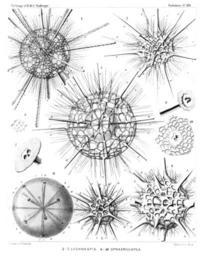 | Keywords: Radiolaria (Challenger) Plate 135.jpg follows <table> <tr> <td style text-align center; vertical-align top; colspan 3 >Plate 135 Sphærocapsida et Dorataspida </td> </tr> <tr> <td style font-size 85 ; text-align right; vertical-align top; colspan 3 >Diam </td> </tr> <tr> <td style vertical-align top; >Fig 1 Hylaspis serrulata n sp </td> <td style vertical-align bottom; >×</td> <td style text-align right; vertical-align bottom; >300</td> </tr> <tr> <td style vertical-align top; >Fig 2 Lychnaspis undulata n sp </td> <td style vertical-align bottom; >×</td> <td style text-align right; vertical-align bottom; >400</td> </tr> <tr> <td style vertical-align top; >Fig 3 Lychnaspis giltschii n sp </td> <td style vertical-align bottom; >×</td> <td style text-align right; vertical-align bottom; >400</td> </tr> <tr> <td style font-size 85 ; padding-left 3em; text-indent -1em; vertical-align top; >The spherical central capsule is enclosed in the shell </td> </tr> <tr> <td style vertical-align top; >Fig 4 Lychnaspis rottenburgii n sp </td> <td style vertical-align bottom; >×</td> <td style text-align right; vertical-align bottom; >400</td> </tr> <tr> <td style vertical-align top; >Fig 5 Zonaspis æquatorialis n sp </td> <td style vertical-align bottom; >×</td> <td style text-align right; vertical-align bottom; >300</td> </tr> <tr> <td style vertical-align top; >Fig 6 Sphærocapsa cruciata n sp </td> <td style vertical-align bottom; >×</td> <td style text-align right; vertical-align bottom; >150</td> </tr> <tr> <td style font-size 85 ; padding-left 3em; text-indent -1em; vertical-align top; >The entire shell with its twenty cruciate perspinal holes </td> </tr> <tr> <td style vertical-align top; >Fig 7 Sphærocapsa cruciata n sp </td> <td style vertical-align bottom; >×</td> <td style text-align right; vertical-align bottom; >800</td> </tr> <tr> <td style font-size 85 ; padding-left 3em; text-indent -1em; vertical-align top; >Insertion of one spine in the cruciate perspinal hole of the shell </td> </tr> <tr> <td style vertical-align top; >Fig 8 Sphærocapsa quadrata n sp </td> <td style vertical-align bottom; >×</td> <td style text-align right; vertical-align bottom; >800</td> </tr> <tr> <td style font-size 85 ; padding-left 3em; text-indent -1em; vertical-align top; >A group of pores and dimples in the shell surface </td> </tr> <tr> <td style vertical-align top; >Fig 9 Sphærocapsa dentata n sp </td> <td style vertical-align bottom; >×</td> <td style text-align right; vertical-align bottom; >800</td> </tr> <tr> <td style font-size 85 ; padding-left 3em; text-indent -1em; vertical-align top; >Insertion of one spine in the cruciate perspinal hole of the shell </td> </tr> <tr> <td style vertical-align top; >Fig 10 Sphærocapsa pavimentata n sp </td> <td style vertical-align bottom; >×</td> <td style text-align right; vertical-align bottom; >800</td> </tr> <tr> <td style font-size 85 ; padding-left 3em; text-indent -1em; vertical-align top; >Insertion of one spine in the perspinal hole of the shell which is composed of four cruciate aspinal holes and surrounded by a group of dimples and pores </td> </tr> </table> https //archive org/details/reportonradiolar00haecrich 1887 Ernst Haeckel 1834-1919 ; engravings by Adolf Giltsch 1852-1911 PD-old-auto-1923 1919 Report on the Radiolaria |