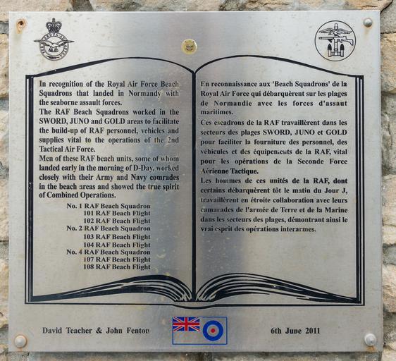 | Keywords: RAF Beach squadrons plaque Arromanches.jpg en RAF Beach Squadrons memorial Arromanches-les-Bains Calvados Normandy France fr Mémorial des escadrons de plage de la Royal Air Force à Arromanches-les-Bains Calvados 2015-04-30 14 34 06 own Jebulon other versions 49 340444 -0 621371 cc-zero Uploaded with UploadWizard War memorials in Calvados Books in art Plaques referencing 2011 Per Ardua Ad Astra Insignia of the Royal Air Force Flags with roundels Quality images by Jebulon Plaques in Calvados Bilingual plaques in France QualityImage |