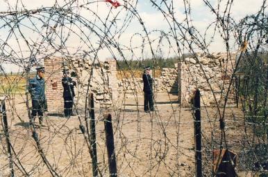Keywords: RAF Molesworth early 80s 2.jpg en RAF Molesworth 1985 Police in front of ruins of Peace Chapel Photographer's own files Tony Grist 2011-02-17 Cc-zero RAF Molesworth