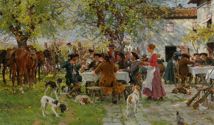 | Keywords: Raffaello Sorbi - Il pranzo dei cacciatori.jpg  Artwork Creator Raffaello Sorbi 1922 oil on canvas cm 59 6 99 8 Private collection place of discovery object history exhibition history credit line Raf Sorbi 1922 signature/date lower right ~ accession number place of creation 36788 “ http //www artrenewal org/artwork/004/1004/36788/Sorbi_Raffaello_The_Huntsmen_Lunch_1922_Oil_On_Canvas-huge jpg image 5287536 2282 44 “ http //www christies com/lotfinderimages/d52875/d5287536a jpg image <br /> italian title http //storiedellarte tumblr com/post/96253485916/raffaello-sorbi-il-pranzo-dei-cacciatori-the storiedellarte tumblr com Custom license marker 2015 03 30 PD-old-auto-1923 1931 Uploaded with UploadWizard Raffaello Sorbi Oil paintings of hunters Paintings of male hunters with dogs Taverns in art People eating in art Paintings of people sitting at tables outdoors 1922 oil on canvas paintings Paintings in private collections Paintings with signatures lower right Paintings with years of production artist  |