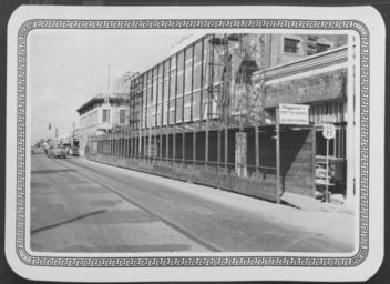 | Keywords: steel steel industry steelindustry steel construction steelconstruction construction industry constructionindustry construction equipment constructionequipment buildings blackandwhite monochrome photo border black and white Photograph of Ragland's, a store in Kingsville, Texas, under construction during a remodeling. The construction was done by Arthur Brothers Incorporated using materials provided by John Dollinger Jr., Inc. Signs at the site read "Ragland's, Open for business, use rear entrance." Scaffolding is on all sides of the building. To the far right is a road sign for "Business Route U. S. 77." Automobiles are in the street to the far left. Photograph of Ragland's, a store in Kingsville, Texas, under construction during a remodeling. The construction was done by Arthur Brothers Incorporated using materials provided by John Dollinger Jr., Inc. Signs at the site read "Ragland's, Open for business, use rear entrance." Scaffolding is on all sides of the building. To the far right is a road sign for "Business Route U. S. 77." Automobiles are in the street to the far left. |