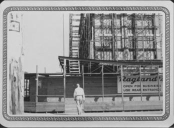| Keywords: steel steel industry steelindustry steel construction steelconstruction construction industry constructionindustry construction equipment constructionequipment buildings blackandwhite monochrome photo border black and white Photograph of Ragland's, a store in Kingsville, Texas, under construction during a remodeling. The construction was done by Arthur Brothers Incorporated using materials provided by John Dollinger Jr., Inc. A man can be seen walking in to a walkway that surrounds the building. To the right is a sign that says "Ragland's, Open for business, use rear entrance." Scaffolding is on all sides of the building. Photograph of Ragland's, a store in Kingsville, Texas, under construction during a remodeling. The construction was done by Arthur Brothers Incorporated using materials provided by John Dollinger Jr., Inc. A man can be seen walking in to a walkway that surrounds the building. To the right is a sign that says "Ragland's, Open for business, use rear entrance." Scaffolding is on all sides of the building. |