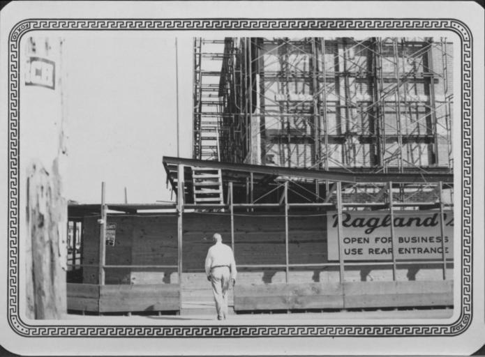 Keywords: steel steel industry steelindustry steel construction steelconstruction construction industry constructionindustry construction equipment constructionequipment buildings blackandwhite monochrome photo border black and white Photograph of Ragland's, a store in Kingsville, Texas, under construction during a remodeling. The construction was done by Arthur Brothers Incorporated using materials provided by John Dollinger Jr., Inc. A man can be seen walking in to a walkway that surrounds the building. To the right is a sign that says "Ragland's, Open for business, use rear entrance." Scaffolding is on all sides of the building. Photograph of Ragland's, a store in Kingsville, Texas, under construction during a remodeling. The construction was done by Arthur Brothers Incorporated using materials provided by John Dollinger Jr., Inc. A man can be seen walking in to a walkway that surrounds the building. To the right is a sign that says "Ragland's, Open for business, use rear entrance." Scaffolding is on all sides of the building.