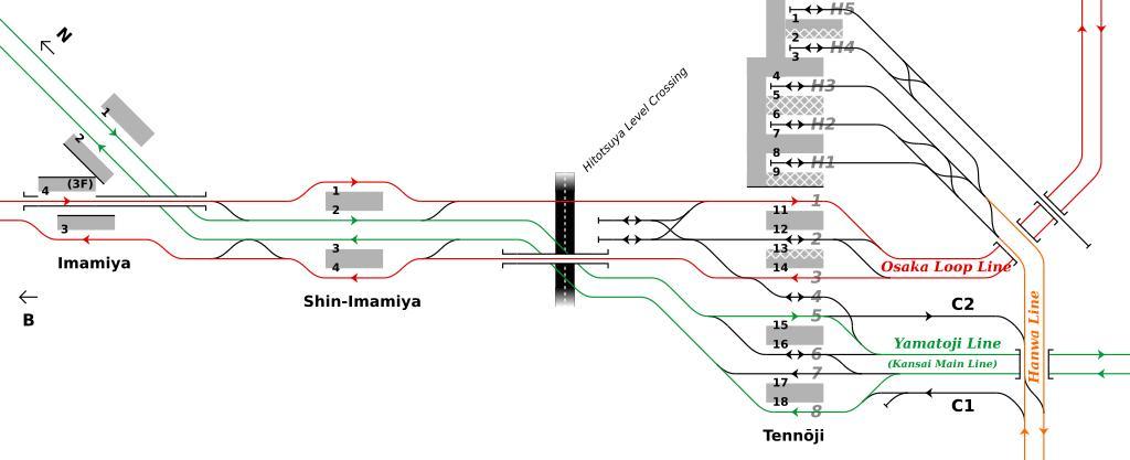 | Keywords: Rail Tracks map JR-W between Imamiya and Tennoji Station.svg Imamiya Station and Tennōji Station JR West Osaka Japan <br /> Railway track Line name colored line red Osaka Loop L orange Hanwa L green Yamatoji L Kansai Main L Connection tracks between Hanwa L and Yamatoji L for Express and Limited Express C1 since 1989 C2 since 2008 Station <small>n</small> smaller black platform No 'n' bigger italic gray track No at Tennōji 'Hn' track No of Hanwa L White crosshatch arrival platform sans-serif font bold black station name Directly access Stations up for Tsuruhashi Kyōbashi Ōsaka by Osaka Loop L right for Ōji Nara Kamo by Yamatoji L Through to the Wakayama L down for Ōtori Wakayama by Hanwa L Through to the Kansai Airport L and the Kisei Main L left N Namba by Yamatoji L B for Bentenchō Nishikujō Ōsaka by Osaka Loop L Through to the Tōkaidō Main L Reference material DENKISHA KENKYUKAI THE RAILWAY PICTORIAL Vol 819 special issue - OSAKA KANJŌSEN Osaka Loop Line Page 42 2009-06 KOYUSHA CO LTD Japan Railfan Magazine Tetsudō Fan Japanese Page 36 Vol 37-11 No 439 1997-11 Ryozo KAWASHIMA Zenkoku Tetsudo Jijyo Daikenkyu - Osaka Nambu Wakayama ISBN 978-4-7942-0516-2 Soshisha Page 17 1993 http //www jr-odekake net/eki/premises php id 0620831 WEST JAPAN RAILWAY official homepage ODEKAKE net - Tennōji Station Japanese 大阪市にあるJR西日 今宮駅から天王寺駅までの配線略図 参 文献: 電気車研究会 鉄道ピクトリアル 巻第819号 2009年6 特集 - 大阪環状線 42頁 特集 JR短絡線ミステリー 鉄道ファン 第37巻11号( 巻第439号) 1997年11 号 36頁 交友社 1997年 島令三 JR阪和線 全国鉄道事情大研究 - 大阪南部・和歌山篇 ISBN 978-4-7942-0516-2 草 社 1993 17頁 http //www jr-odekake net/eki/premises php id 0620831 JR西日 公式ホームページ JRおでかけネット - 天王寺駅(大阪 )- 構内図 凡例は駅配線図テンプレートを参照 Plan de voies Created with Text Editor Tawashi2006 created from icons in Category Rail_tracks_map_template 2009-05-24 Tawashi2006 with http //kiritachinoboru tripod com/pdv2svg_en html pdv2svg Tawashi2006 300px ja validSVG translation possible Rail track diagrams of JR West train stations |
