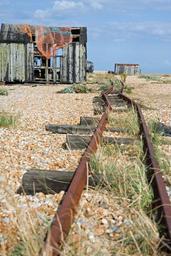 Keywords: rail tracks old disused beach rusty shingle shack shed fishing net orange sky clouds scene scenic