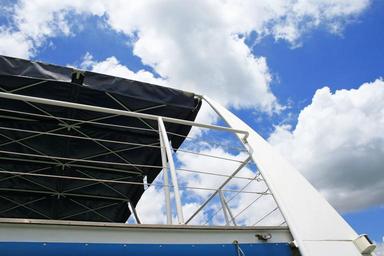 Keywords: railing and roof of cruise vessel railing white restraint upper deck roof covering sky blue clouds