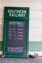 Keywords: railway chalkboard timetable rail board transport transportation travel train departures dog bowl steam historic platform journey