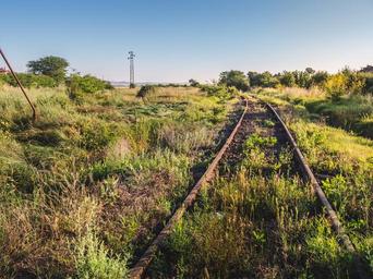 Keywords: railway rail track transport transportation journey old way past confusion sunny sky grass green homesickness