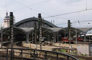 Keywords: railway station gleise lines traffic cologne masts platform sky blue concourse central station