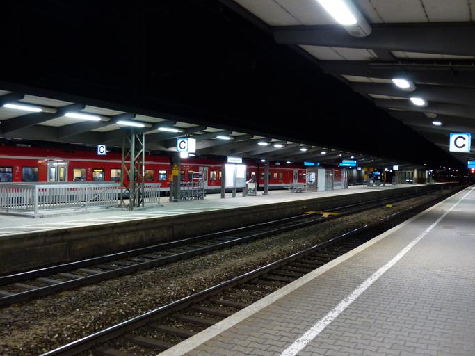 Keywords: railway station platform train railway breakpoint old traffic rail traffic railroad track track central station ad clock departure transport seemed luggage cart stairs