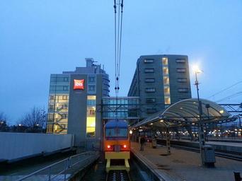 Keywords: railway station rail traffic railway gleise seemed railroad track traffic travel amsterdam netherlands hotel railway traffic train locomotive transport building skyscraper upper lines hotel ibis