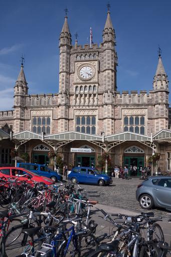 Keywords: railway station taxi bicycles forecourt clock pedestrian travellers travel departure arrival transport architecture building